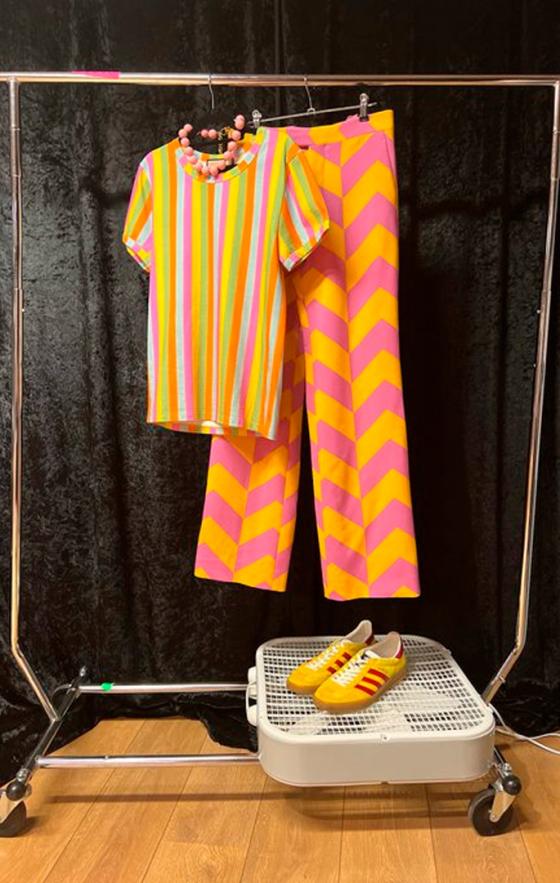 En el reciente concierto que tuvo en Bogotá, Colombia, utilizó un pantalón verde con una franja rosa en los laterales, una camiseta rosa de lentejuelas y unas zapatillas verdes terciopelo.