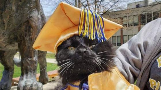 Así que, la dueña de Salem no dudó en comprarle un toga y birrete al minino para que la acompañara a recibir su diploma.