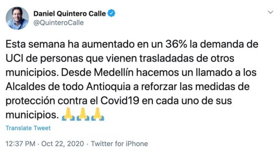 "Esta semana ha aumentado en un 36% la demanda de UCI de personas que vienen trasladadas de otros municipios. Desde Medellín hacemos un llamado a los Alcaldes de todo Antioquia a reforzar las medidas de protección contra el Covid-19 en cada uno de sus municipios", escribió el mandatario en su cuenta de Twitter.