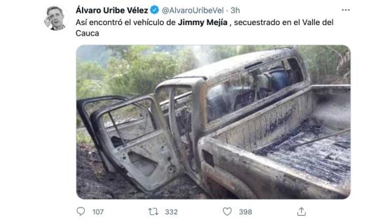 "Así encontró el vehículo de Jimmy Mejía, secuestrado en el Valle del Cauca", escribió Uribe en su cuenta de Twitter, donde compartió la fotografía de la camioneta incinerada.