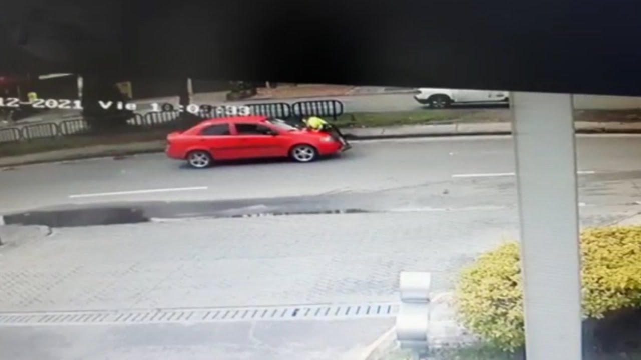 Un policía de tránsito estaba en un retén y le pidió a un carro que se detuviera ante pero el conductor hizo todo lo opuesto. El joven estaba en un automóvil rojo y pasó por encima del oficial, el cual quedó montado en el capó del vehículo.