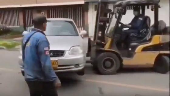 En video quedó registrado el momento en que un par de sujetos usa un montacarga con el que mueven un carro mal parqueado en Bogotá.