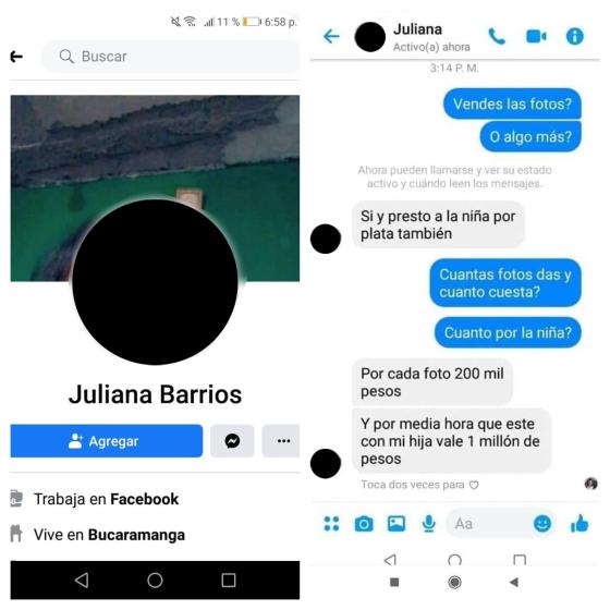 El concejal Beltrán le compartió a KienyKe.com algunos pantallazos que los denunciantes lograron obtener del perfil de Facebook de la cuenta identificada como Juliana Barrios. En una conversación, la persona, que al parecer es la madre de la niña, dice que “la presta por plata”, que por cada foto cobra 200 mil pesos y que “por media hora con ella cobra un millón”.