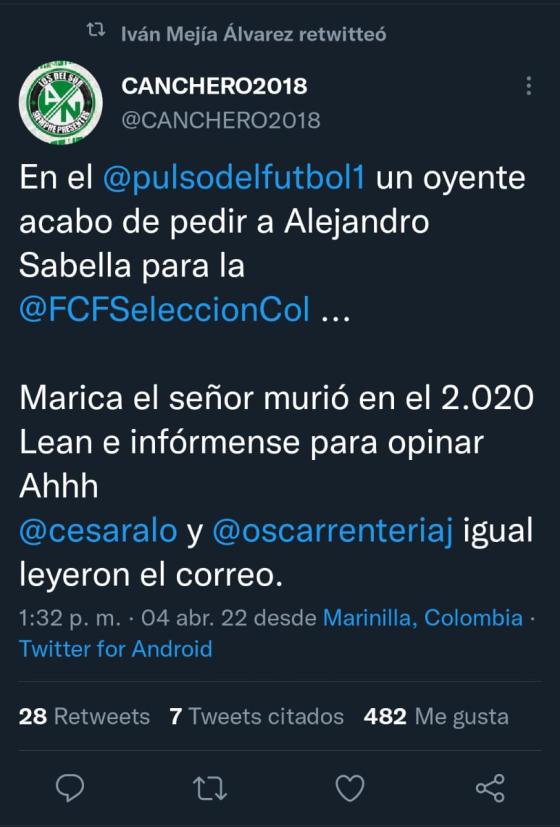“En el @pulsodelfutbol1 un oyente acabo de pedir a Alejandro Sabella para la @FCFSeleccionCol ...Mar*/% el señor murió en el 2020. Lean e infórmense para opinar. Ahhh @cesaralo y @oscarrenteriaj igual leyeron el correo”.