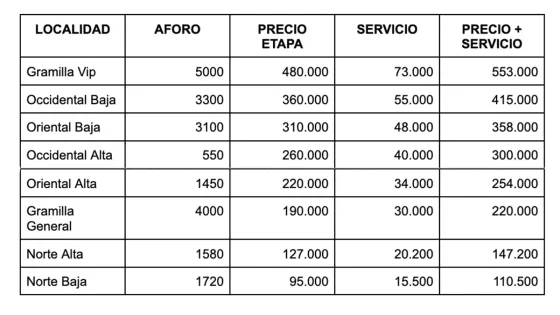 El valor de las entradas oscilan entre los $ 110.000 COP hasta $ 553.000 COP. Se podrán conseguir a través de la preventa exclusiva para clientes del Banco Falabella a partir del 15 de septiembre, y para el público en general desde el 16 de septiembre a mediodía a través de TuBoleta.