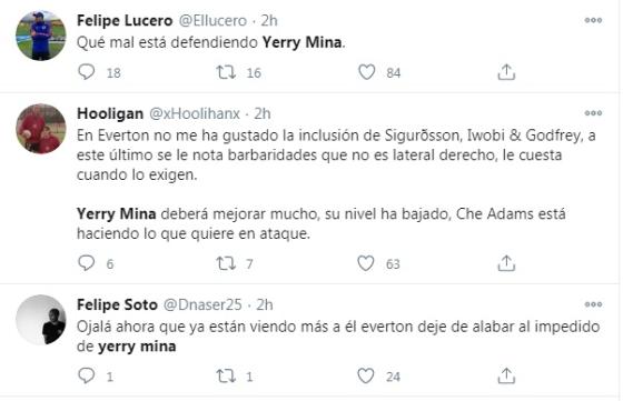 "¿En qué momento pensamos que Yerry Mina tenía nivel para jugar en una liga top de Europa?"; "Yerry Mina deberá mejorar mucho, su nivel ha bajado, Che Adams está haciendo lo que quiere en ataque", fueron algunos de los comentarios en contra del defensa de Cuachené, Cauca.