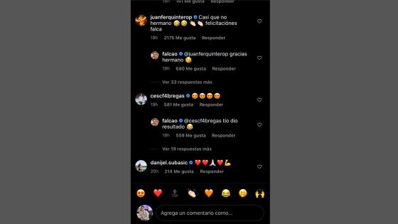 Su publicación ha generado más de seis mil comentarios y medio millón de 'me gusta'. Entre las reacciones apareció una respuesta peculiar de Juan Fernando Quintero, jugador de River Plate. "Casi que no hermano. Felicitaciones Falca", señaló en celebración al hijo de su colega.