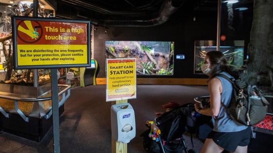 Visitante usa mascarilla mientras visita la casa cerrada de los reptiles.