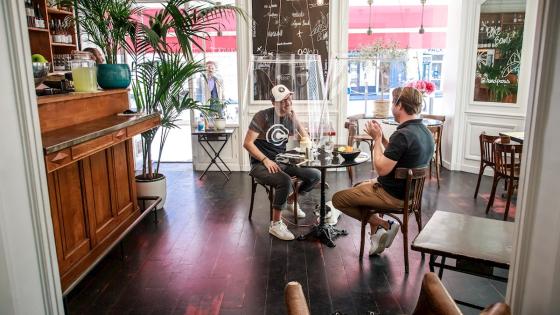 El diseñador francés Christophe Gernigon posa con su creación 'la burbuja de plexiglás' que rodea a los clientes para protegerlos de la infección por covid-19 durante una presentación en el restaurante HAND en París.