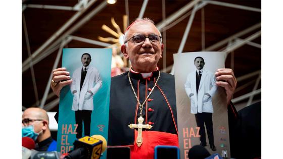 El cardenal Baltazar Porras sostiene afiches de José Gregorio Hernández, este viernes, en la Iglesia Parroquia Inmaculado Corazón de María de Caracas (Venezuela). Venezuela celebró este viernes, con la contención obligatoria por la pandemia de COVID-19, el anunció de la próxima beatificación del doctor José Gregorio Hernández, el médico de los pobres al que el cardenal Baltazar Porras exaltó como un símbolo de unidad para todo el país por encima incluso del libertador Simón Bolívar.