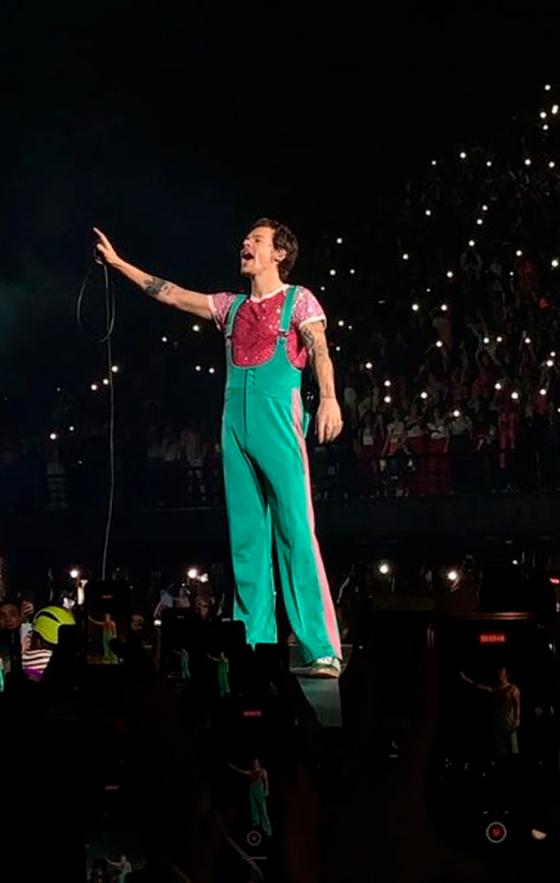 En Dublín, utilizó un enterizo sin mangas de rayas diagonales de rayas color verde menta con un cinturón que acentuó la figura del cantante y unas zapatillas rojas terciopelo de una colaboración de Adidas con Gucci.