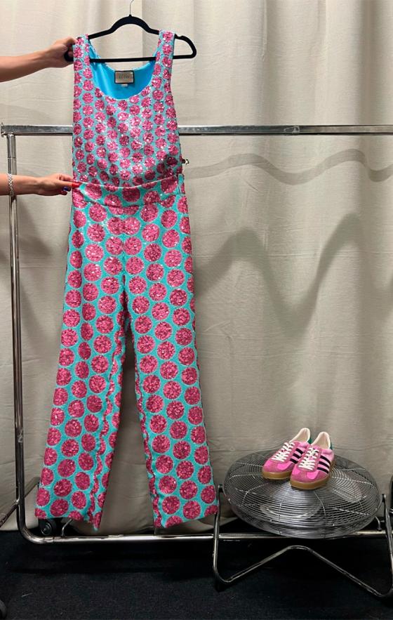 En New York, Estados Unidos, utilizó un conjunto de pantalón y camiseta sin mangas azul claro con puntos rosados de lentejuelas, acompañado de unas zapatillas rosadas terciopelo de una colaboración con Adidas con Gucci.