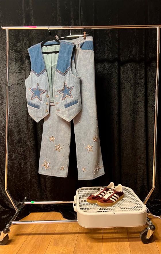 En otra de las fechas que realizó en New York, utilizó un conjunto de jean. Un chaleco con algunos detalles brillantes y pantalón tipo vaquero cuya parte inferior tuvo estrellas plateadas con unas zapatillas rojas terciopelo en una colaboración de Adidas con Gucci.