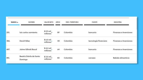 De igual forma, la Revista Forbes hace una categorización por países para revelar quiénes son los personajes más adinerados de cada nación. Esta lista que fue publicada este martes 5 de abril incluyó por supuesto quienes son los colombianos con más patrimonio actualmente.