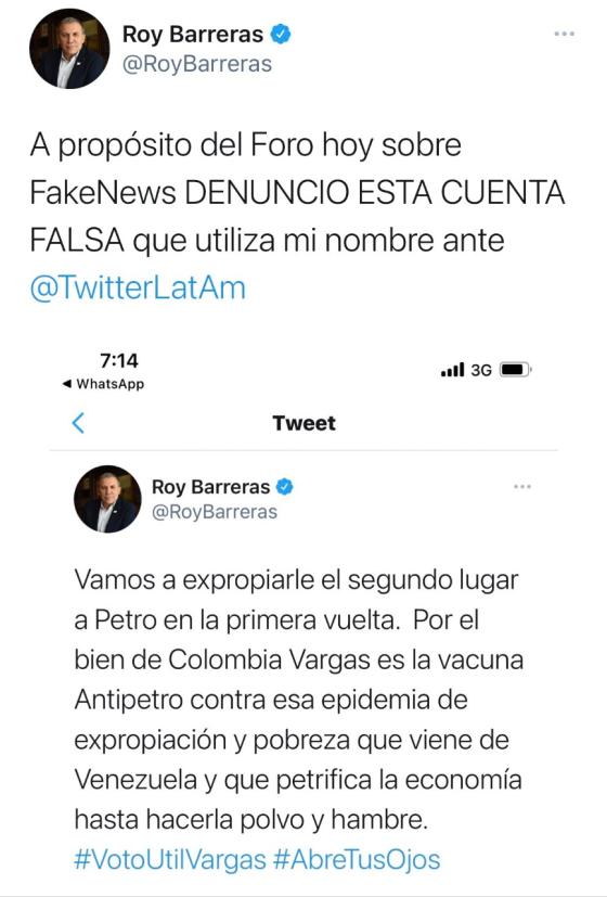 De hecho, la publicación estaba acompañada de una captura de pantalla de un trino publicado en abril de 2018 que decía: "Vamos a expropiarle el segundo lugar a Petro en la primera vuelta. Por el bien de Colombia Vargas es la vacuna Antipetro contra esa pandemia de expropiación y pobreza que viene de Venezuela y que petrifica la economía hasta hacerla polvo y hambre. #VotoUtilVargas #AbreTusOjos".