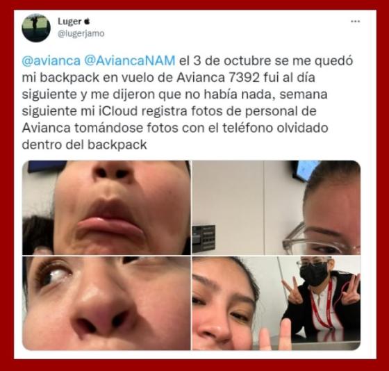 Sin embargo, aunque en el lugar le habrían dicho que “no había nada”, la mujer asegura haber recibido numerosas fotografías con varias mujeres con uniforme de Avianca en la sincronización de Icloud, el servicio de nube que tienen los productos Apple: “Semana siguiente mi iCloud registra fotos de personal de Avianca tomándose fotos con el teléfono olvidado dentro del backpack”, denunció.