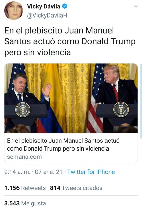 El artículo que generó el conflicto fue titulado: “En el plebiscito Juan Manuel Santos actuó como Donald Trump pero sin violencia”. En él hace una comparación entre lo que pasó en el Capitolio de Estados Unidos con la implementación del Acuerdo de Paz, pues indica que el exmandatario y sus aliados “utilizaron al Congreso, a través del mecanismo fast track y con el aval de las cortes, para imponer su acuerdo de paz con las Farc aunque los colombianos lo habían rechazado en las urnas”.