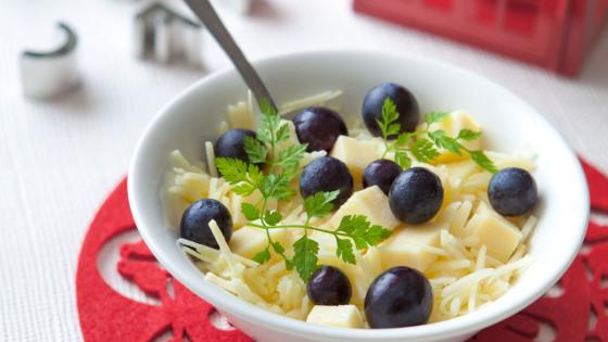 Colóquelas en un recipiente, agregue el yogurt griego y mezcle. Por último corte el queso en cuadros y agregue uvas y perejil para decorar.